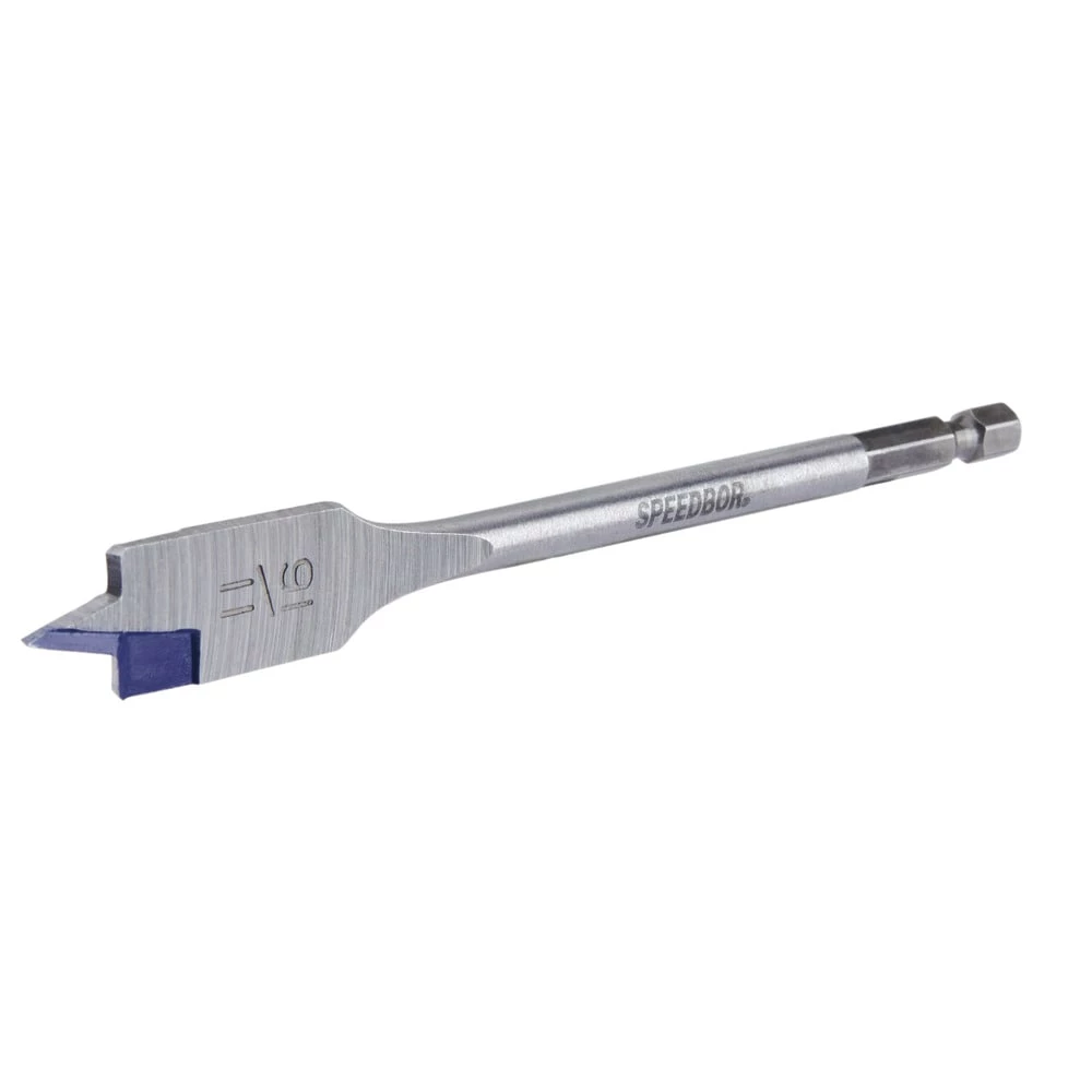 The improved SPEEDBOR Spade Bits now last 2X Longer and cut 2X Faster. Next-generation SPEEDBOR® Spade Bits feature a chamfered cutting edge for durability in cutting wood and optimized point tip that is wider and longer than previous IRWIN spade bits to minimize splintering and control speed. Patented Blue-Groove® cutting edge allows for a large cutting area for aggressive removal of wood chips and fast drilling.