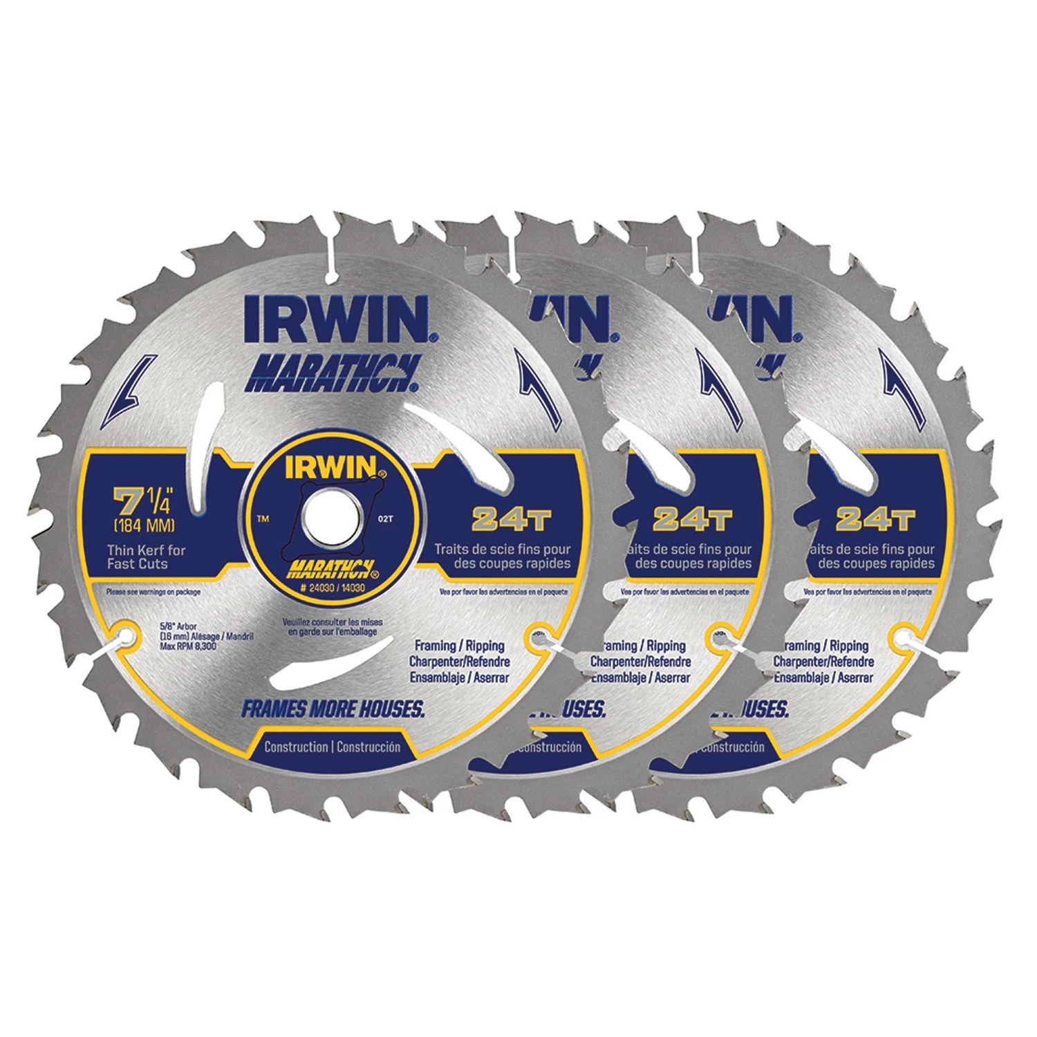 IRWIN Marathon’s 7-1/4-in 24-tooth circular saw blade is designed for long-term use on wood and plywood. It’s compatible with handheld circular saws and can withstand the heavy demands of the job site or a major DIY project. It demonstrates durability and longevity without sacrificing the speed and precision of your cut. It cuts smoothly, too. This 3-pack blade set is an economical option that professionals can use for home projects as well as for more demanding everyday operations. It cuts through materials well and stays sharp for a long time. Shop the 3-pack 24-tooth circular saw blade set and other IRWIN Marathon products at Lowes.com.