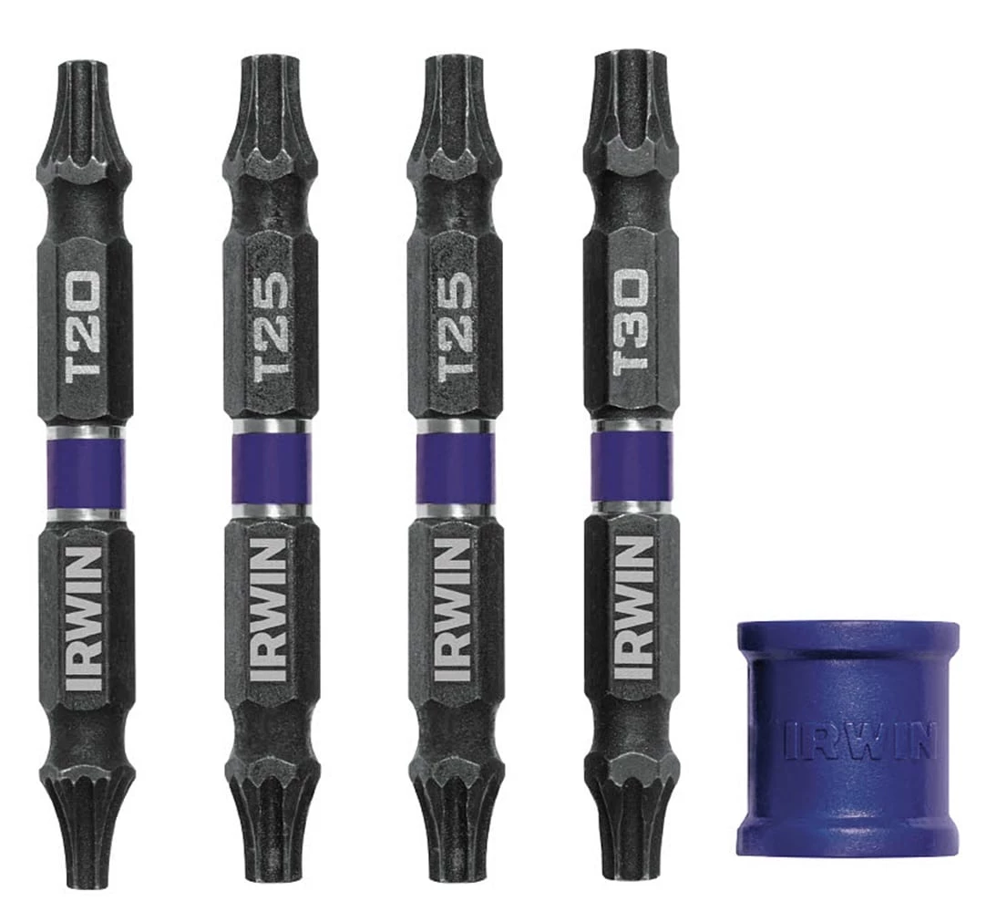 - Set includes 4 double-ended 2-3/8-in bits: 1 T15/T20, 1 T20/T25, 1 T25/T30, 1 T25/T25; plus 1 magnetic screw-hold attachment