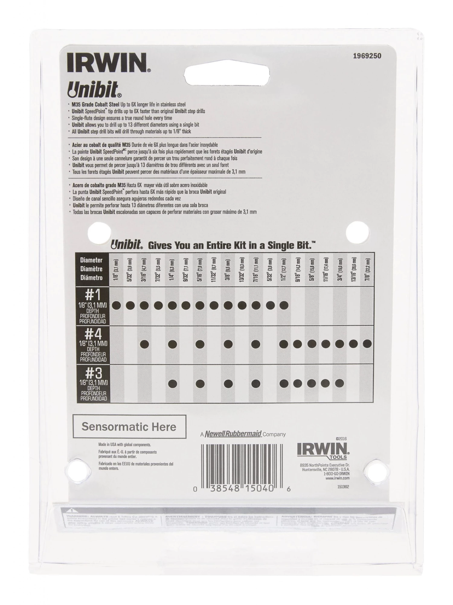 - Unibit #1 contains a 1/4-in hex shank and will drill 13 hole sizes- 1/8-in-1/2-in (1/32-in steps)