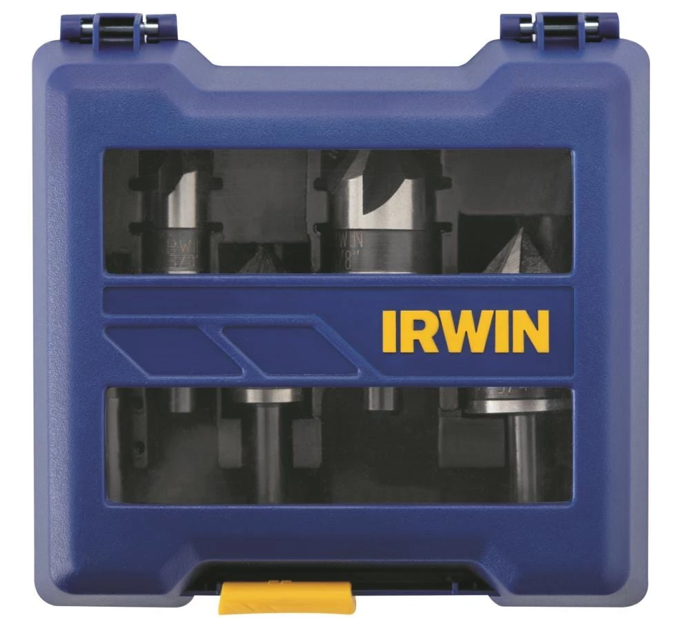 The IRWIN Metal Countersink Drill Bit Set features precision ground 82ยฐ tips for countersinking most machinable metals, wood, and plastic. Made from industrial grade high-speed steel for increased durability, each countersink has a black oxide coating to resist corrosion and a five-flute design that reduces vibration for smoother drilling and an extended life. Set includes 1/4-in, 3/8-in, 1/2-in, 5/8-in, and 3/4-in countersinks, and a drawer case.